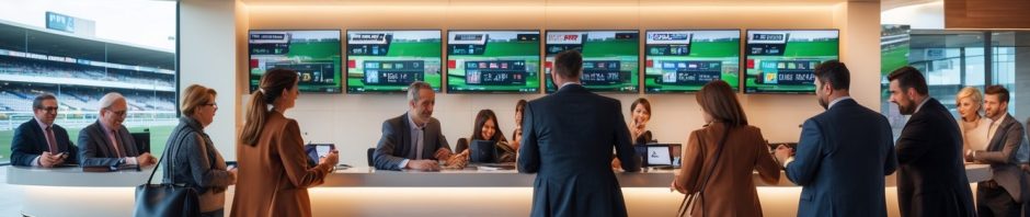 Suasana agen judi balap kuda resmi dengan pelanggan yang sedang memasang taruhan dengan latar layar menampilkan balapan kuda.